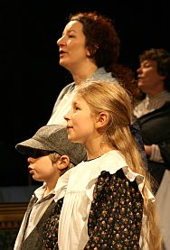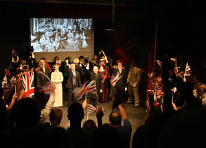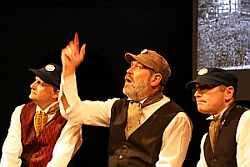 These six characters led us through the years covering the building of the reservoirs, interacting well together and at times involving the audience in their discussions and arguments. The setting of the stage was simple but highly effective; the backdrop to the action was a large screen on which we saw historical photographs and maps, mostly ignored by the characters but occasionally used by them to provide explanations for decisions made. What could have been a rather long, dry lecture was superbly punctuated by the supporting cast and the musical interludes. A number of cameos – delightful Bradford Mill Workers and children, robust Nidderdale “Riparian Owners” and three fearsome Bradford “Ladies” – all helped to move the action along at a brisk pace. This was a measure of the consummate skill with which the play had been written and directed.