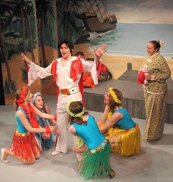 Scenes switched from a Frost Fair on the River Thames, to a Fairyland Joke Contest, to a Desert Island with ‘Elvis’, to Cannibals in the Jungle. Backstage had a mammoth job to do and they did it very well. Costumes were outstanding.