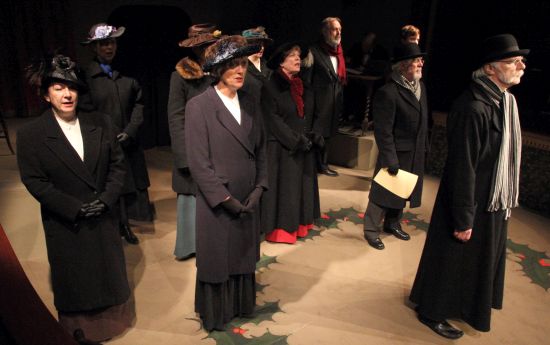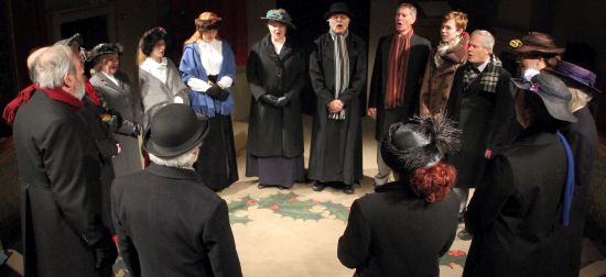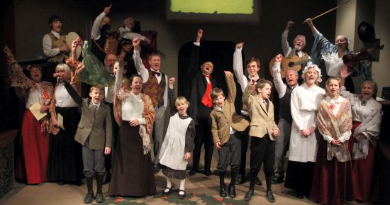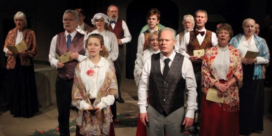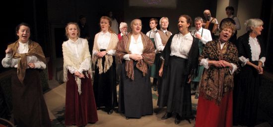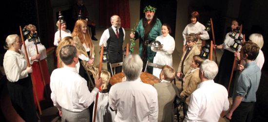 Nevin Ward’s musical interpretation takes this on board and it is what makes his production so very special. The well-known tale, with its Christian themes of transformation and redemption, is given a popular turn by the singing of local carols, from Cornwall, Sussex, Yorkshire and elsewhere, with words relevant to the play’s text and story development. From the opening “Nowell and Nowell” there is emphasis on the communal nature of the songs, as one caroller on stage is gradually joined by others to form a large carol-singing group with audience participation.