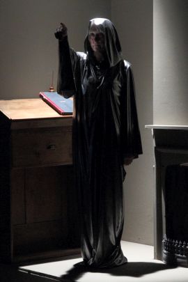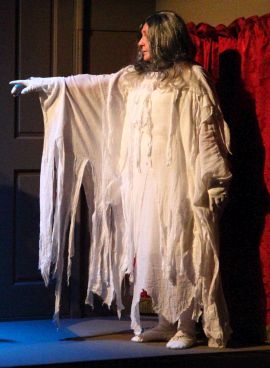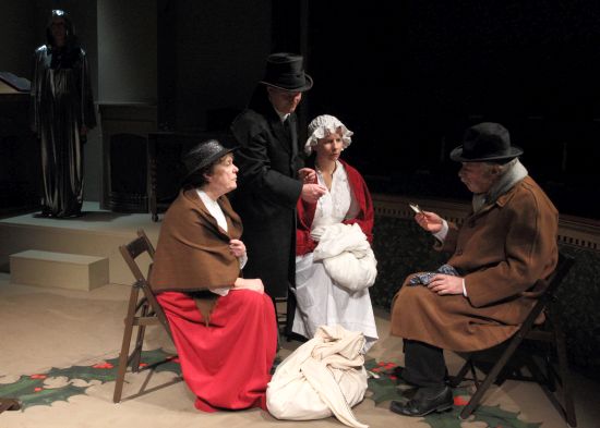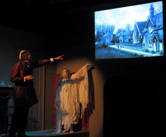 The three Ghosts of Christmas Past Present and Yet To Come, played by the nostalgic Christine Ward, the jovial Jerry Harvey and the eerie Jo Jefferson, haunt Scrooge with his unhappy past, and show him a present in which the long-suffering Cratchits endure their losses but stay big-hearted. In contrast, there lies before him his own inevitably bleak future in the deserted graveyard.