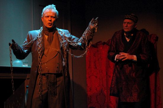 Keith Burton, brilliantly infernal as Marley’s Ghost with clanking chains, plays him as having a moral concern for charity, mercy, forbearance, and benevolence.
