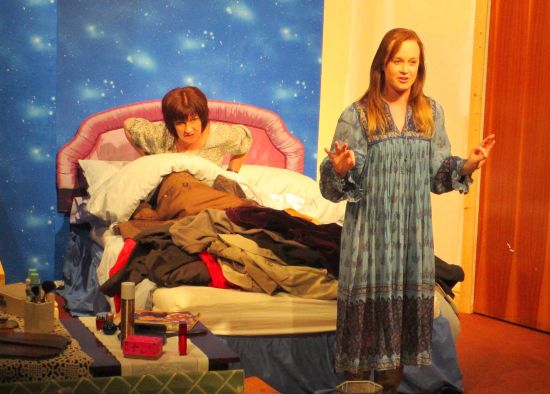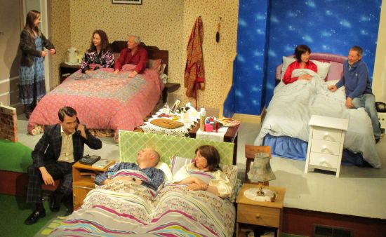 As the audience took their seats they soon became aware that one of the three beds was already occupied by the hapless Nick, played superbly by Tom Barber, and apart from a spell when he fell on the floor, he remained in bed throughout the entire evening, including the interval. Nick’s bad back prevented him from leaving his bedroom but not from grouching and whingeing “Why me?” at regular intervals. Tom was entirely convincing as a spinal injury patient who struggled to find a comfortable position and when he fell out of bed whilst trying to retrieve his book, the audience was torn between concern and amusement.