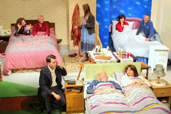 The play isn’t a farce in the traditional sense of the term: it is far more of a wholesome comedy concerning four couples and three bedrooms. There is one illicit kiss (although it’s hardly scorching) and the most any couple gets up to in bed is eating pilchards on toast! Humour, however, there is in plenty in this comedy of manners.