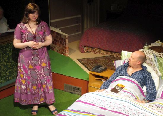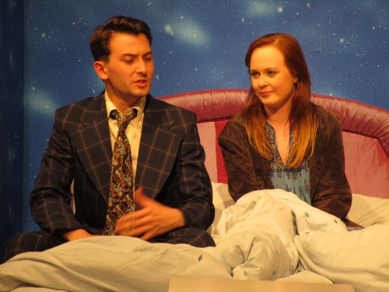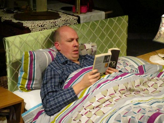 The final couple, neurotic Susannah and the infuriating Trevor, were played by Sarah Burton and Ben Derrick. Trevor, the spoiled son of Ernest and Delia, arrived at Kate and Malcolm’s party to bring havoc to all he surveyed. Sarah Burton brought a refreshing, clear silliness to Susannah that brought chaos to the two bedrooms that she visited. Sarah never allowed Susannah’s self-absorption and flaky personality, although deliciously comic, to stray into the ridiculous. Although we never saw these two in their own home, we watched them selfishly spread their problems throughout the bedrooms of the other couples, opening up cracks in others’ relationships as they hopelessly tried to salvage their own.