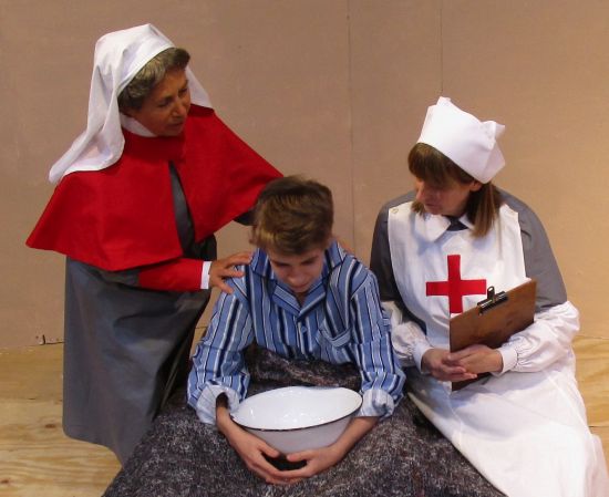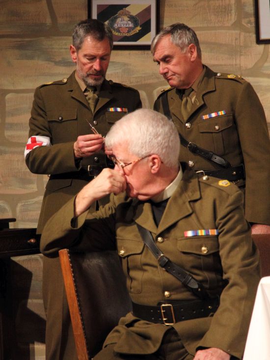 Also at the high table is the Matron, played with brisk authority by Ruth Dodsworth who reveals humanity beneath a fearsome outer shell. Joyce Liggins as Sister Dearing is equally caring, and though separated by rank, both of them deftly combine efficiency with compassion. One of the Sister’s patients Private Watson is a good cameo by Playhouse veteran Iain Johnson – the epitome of the bandaged delivering the badinage.