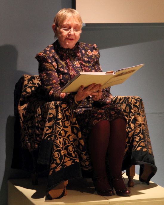 The audience, when they first made their way up to the auditorium, found members of the cast already assembling on the apron stage chatting to the early arrivals. This early engagement with the audience paid dividends when audience participation was called for; we wanted to support them and help them. The huge book stood closed, with the music corner ready prepared and the various instruments and the narrator’s chair in position. Once opened the book became a giant screen on which Chris Iredale’s beautiful photographs informed us of the locations as the play progressed.