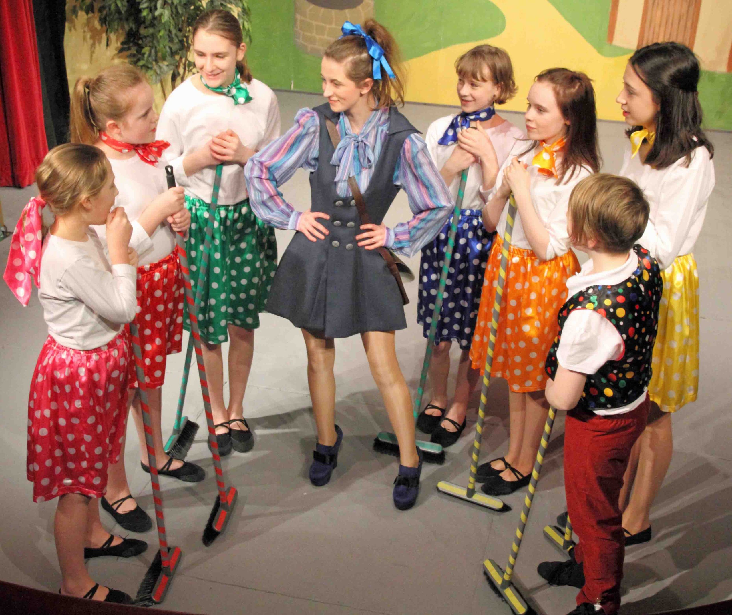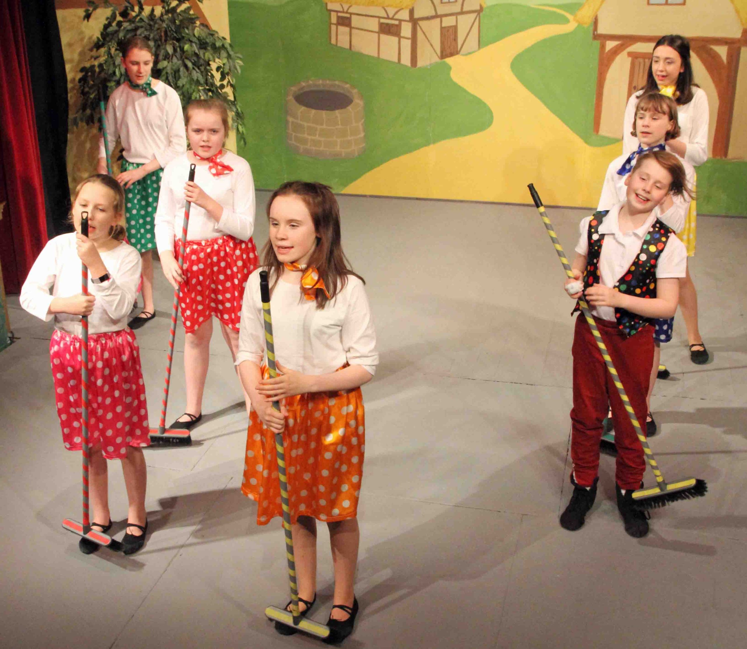 As the curtains opened we saw the seven young chorus members with brooms, bemoaning their lot in a song and dance routine, the first of a number of occasions in which they played many roles, invariably delivered with committed energy and verve.