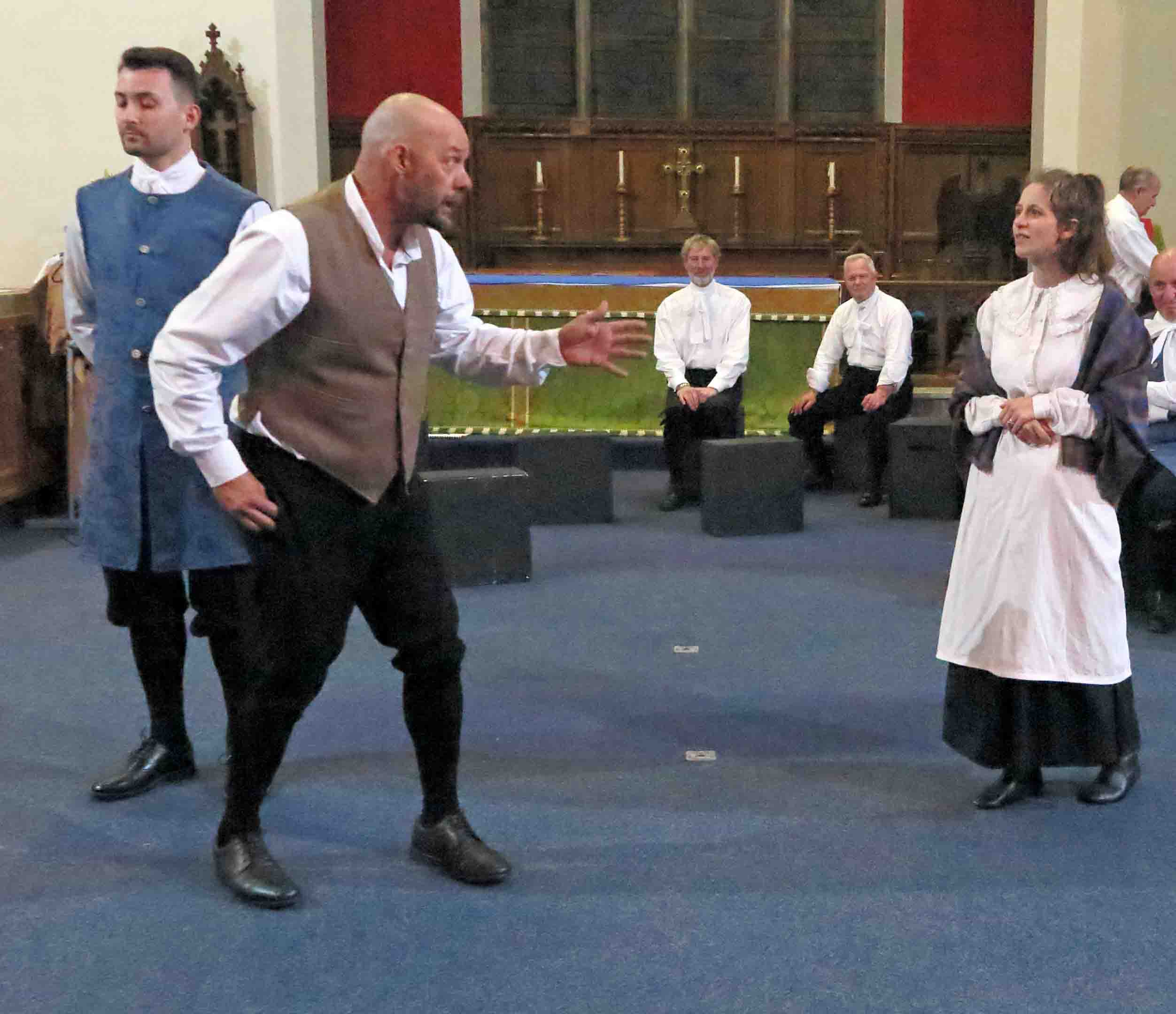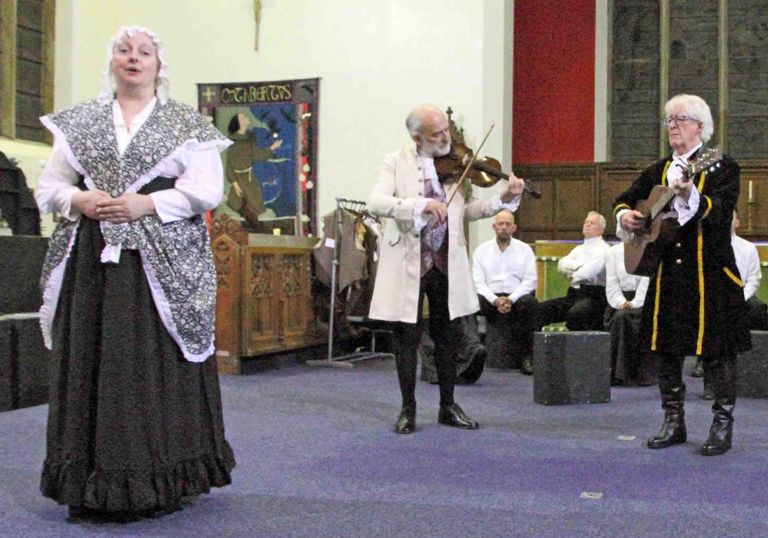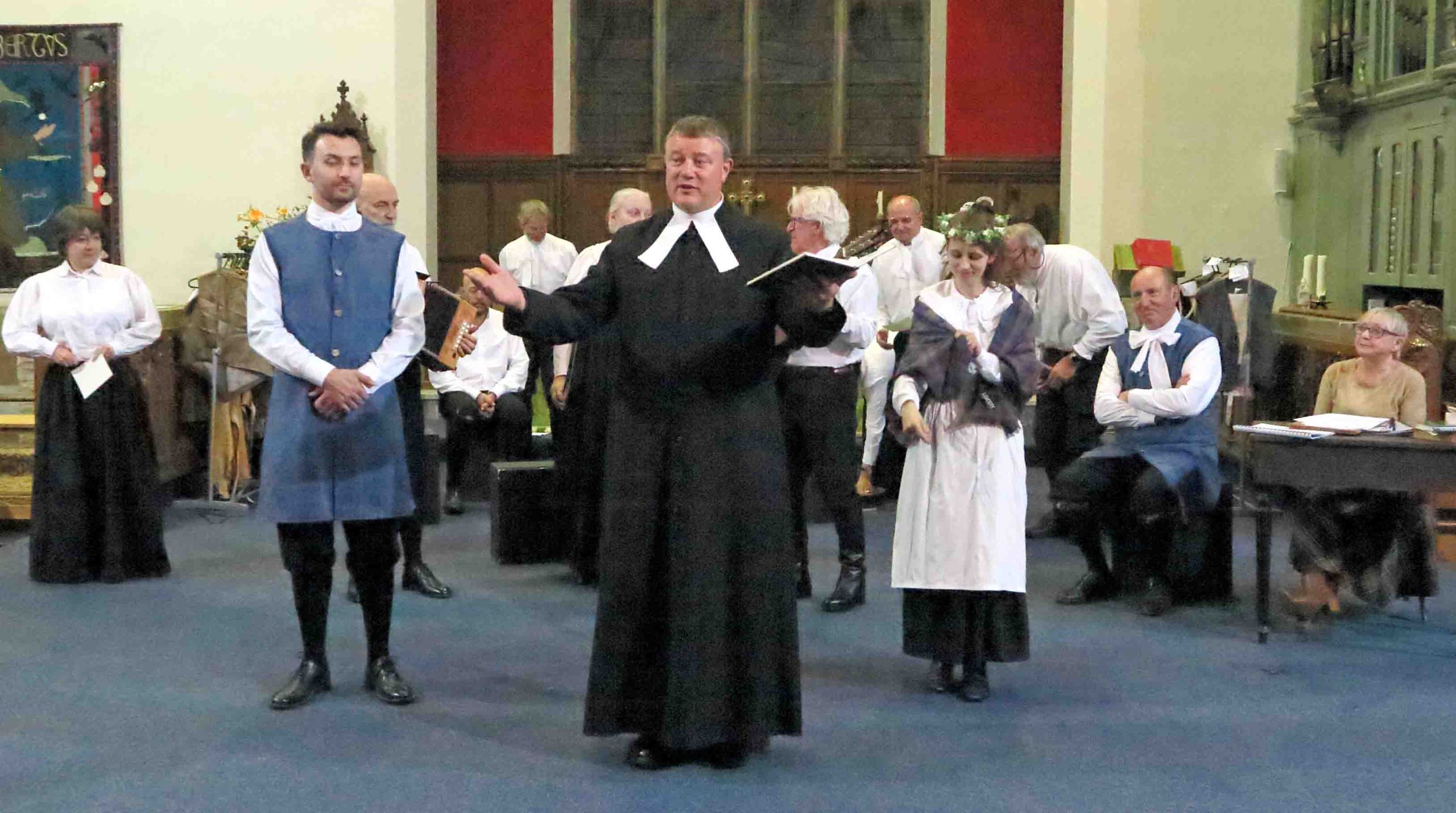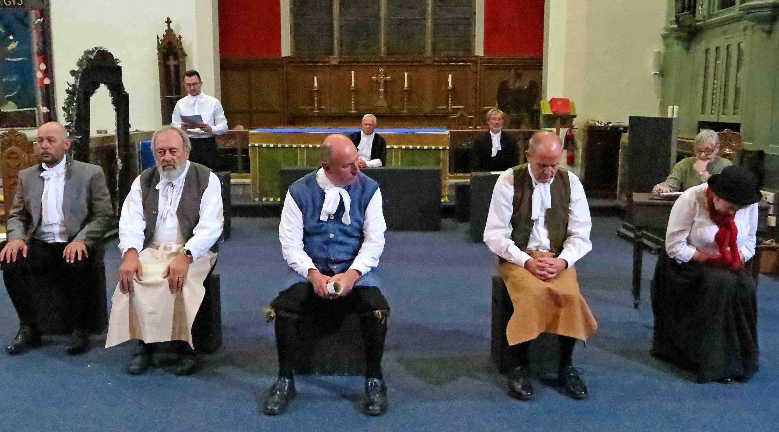 The atmosphere in St. Cuthbert‘s Church Pateley Bridge was lively, bustling and expectant. People were milling around, greeting friends and acquaintances as if they had not seen them for many months. They were selecting chairs at the front of the church when normally they would sit as far back as possible! The altar had gone and in its place was a large open area. The people purposefully congregating in this space were dressed in basic attractive black and white attire from three hundred years ago.