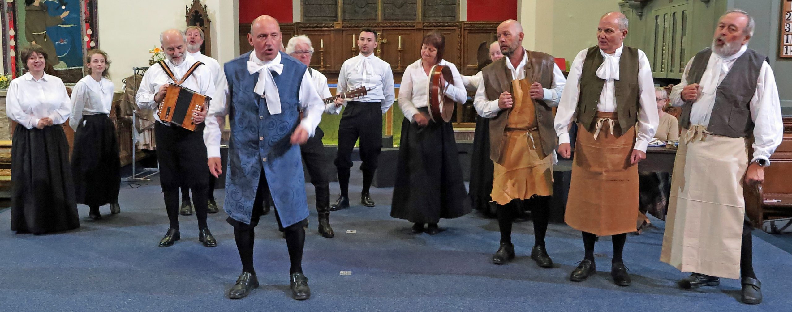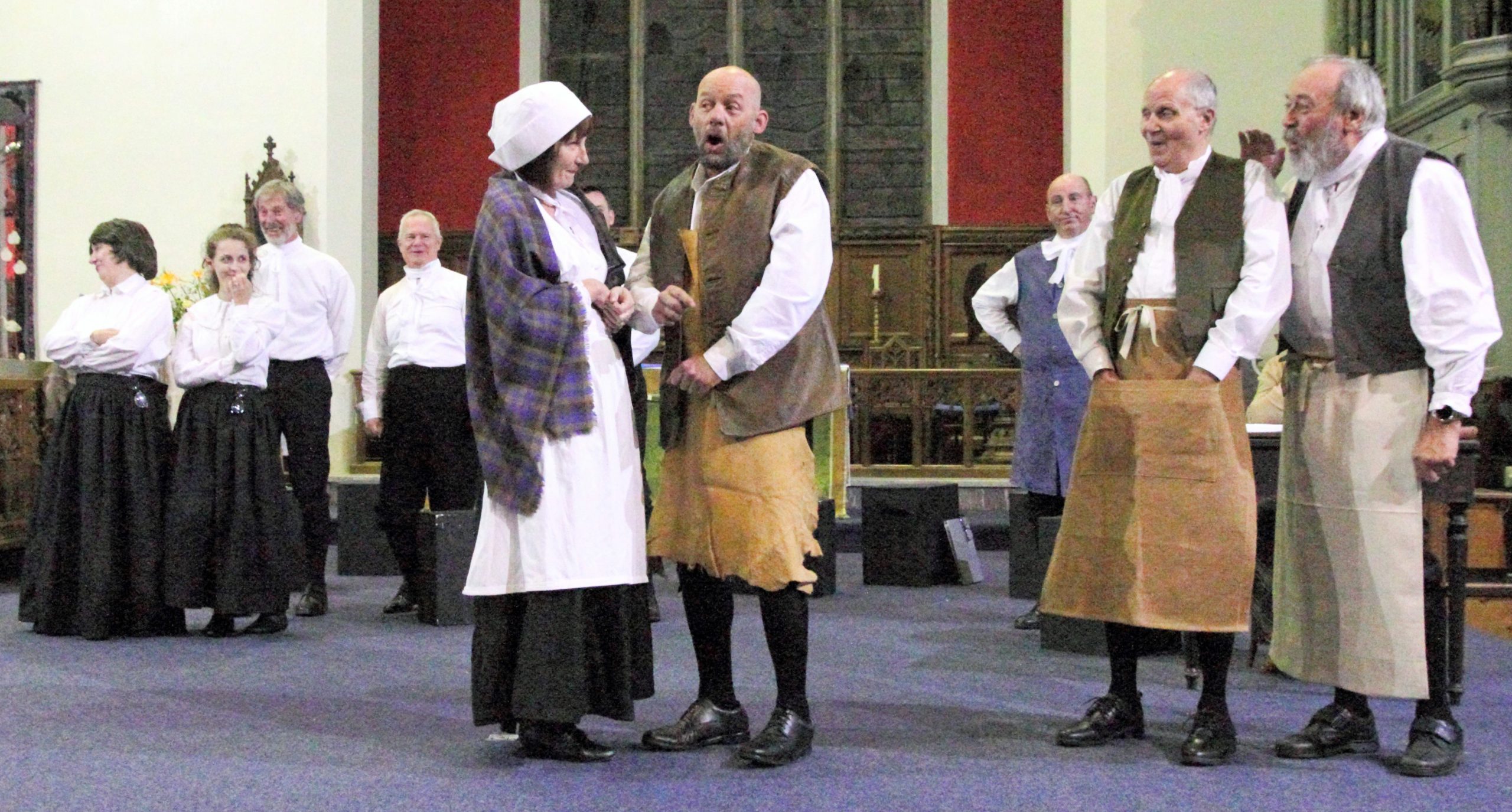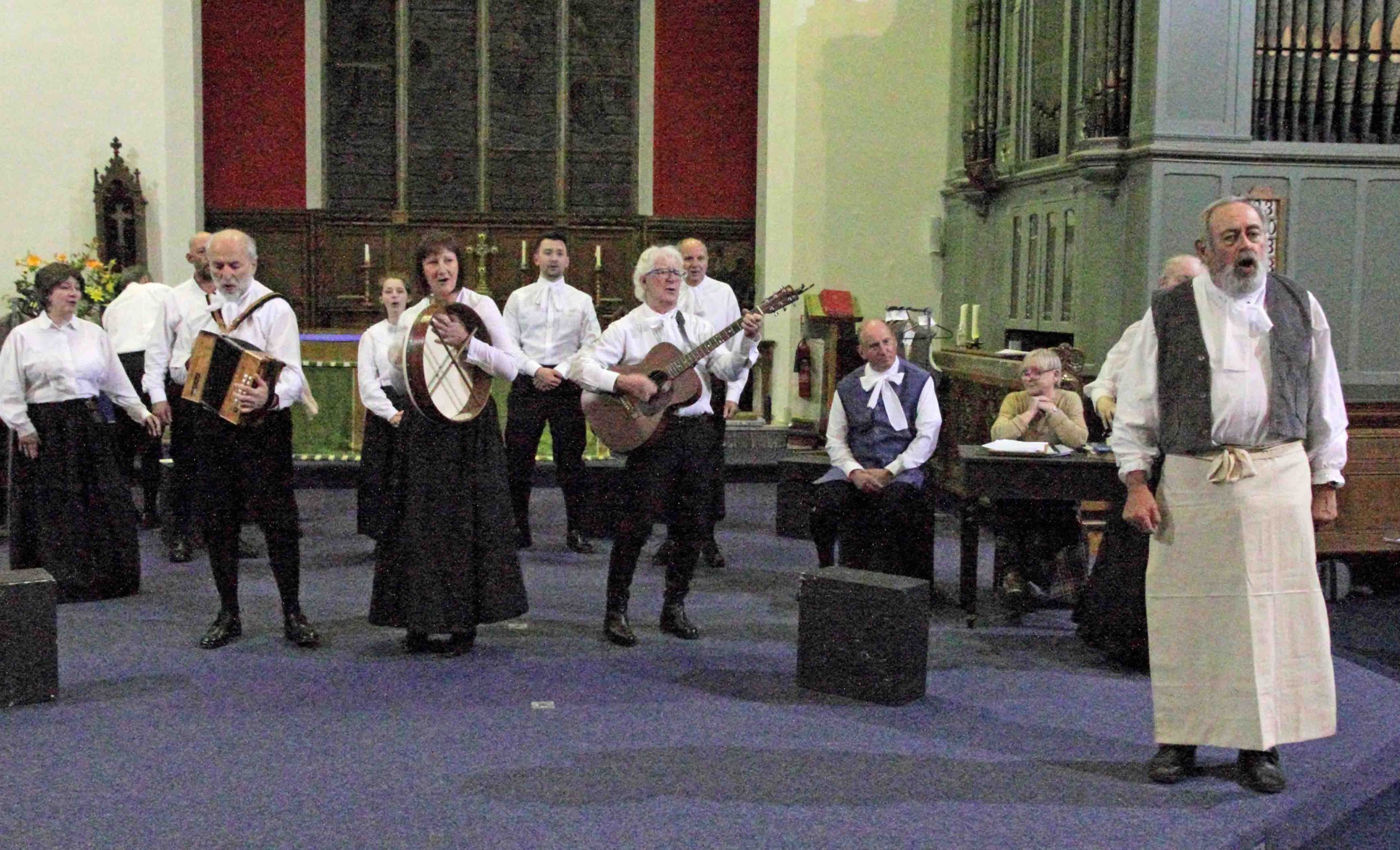 The atmosphere in St. Cuthbert‘s Church Pateley Bridge was lively, bustling and expectant. People were milling around, greeting friends and acquaintances as if they had not seen them for many months. They were selecting chairs at the front of the church when normally they would sit as far back as possible! The altar had gone and in its place was a large open area. The people purposefully congregating in this space were dressed in basic attractive black and white attire from three hundred years ago.
