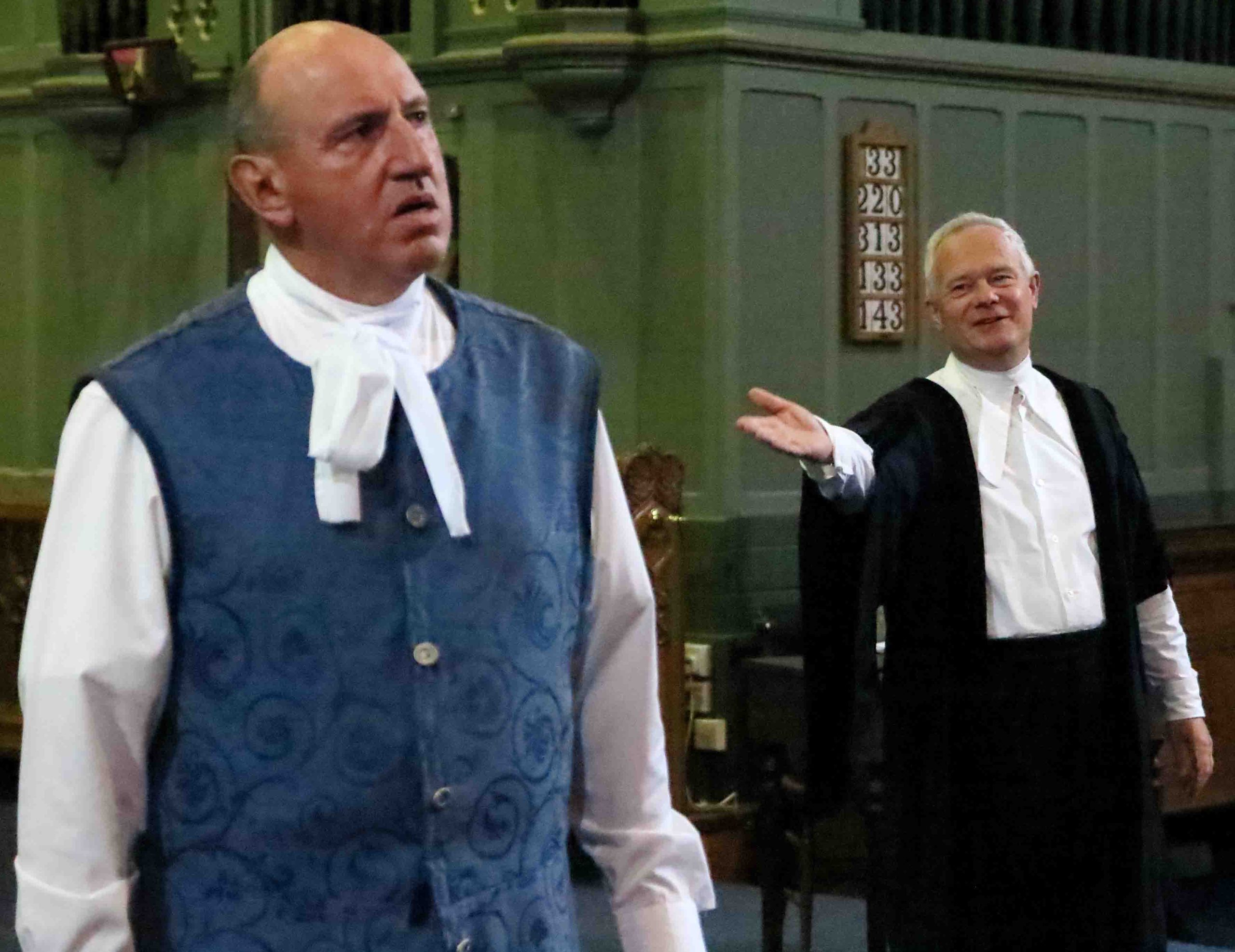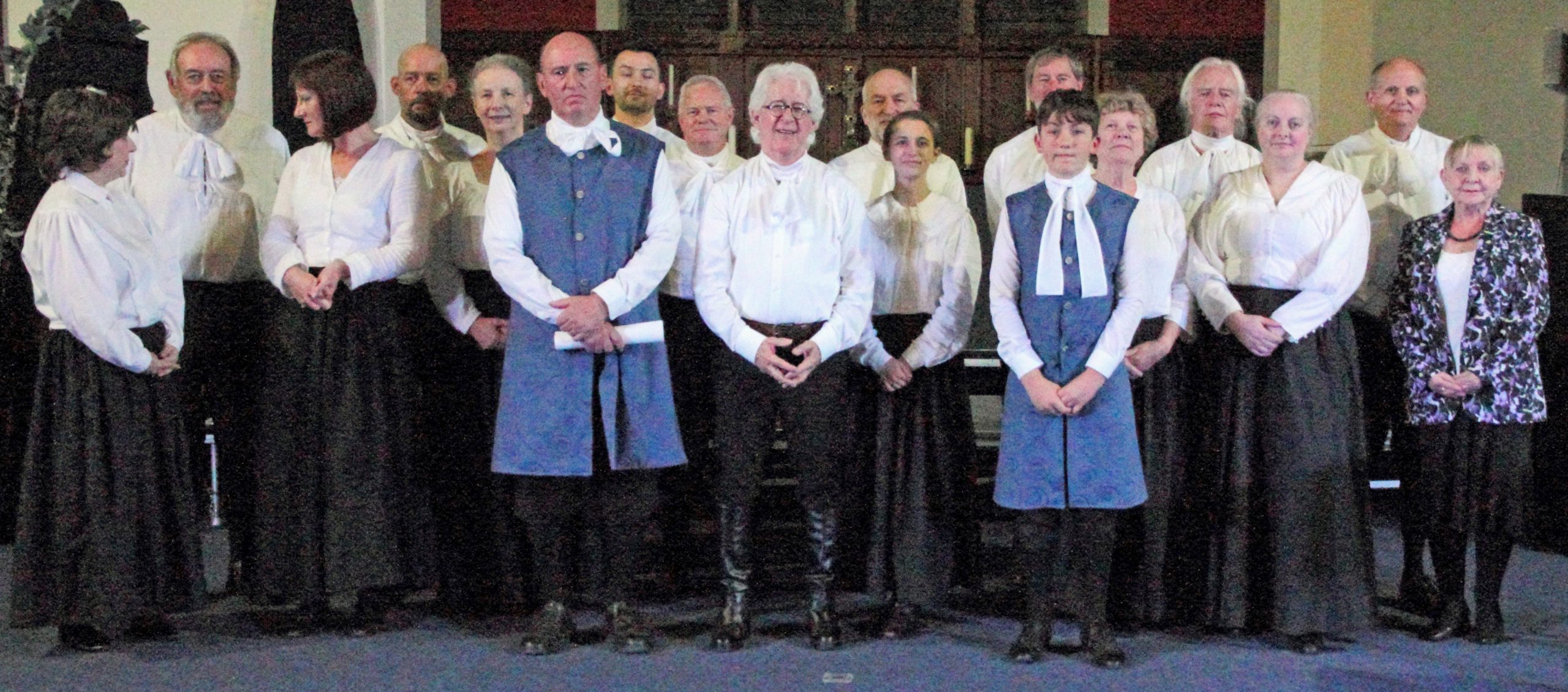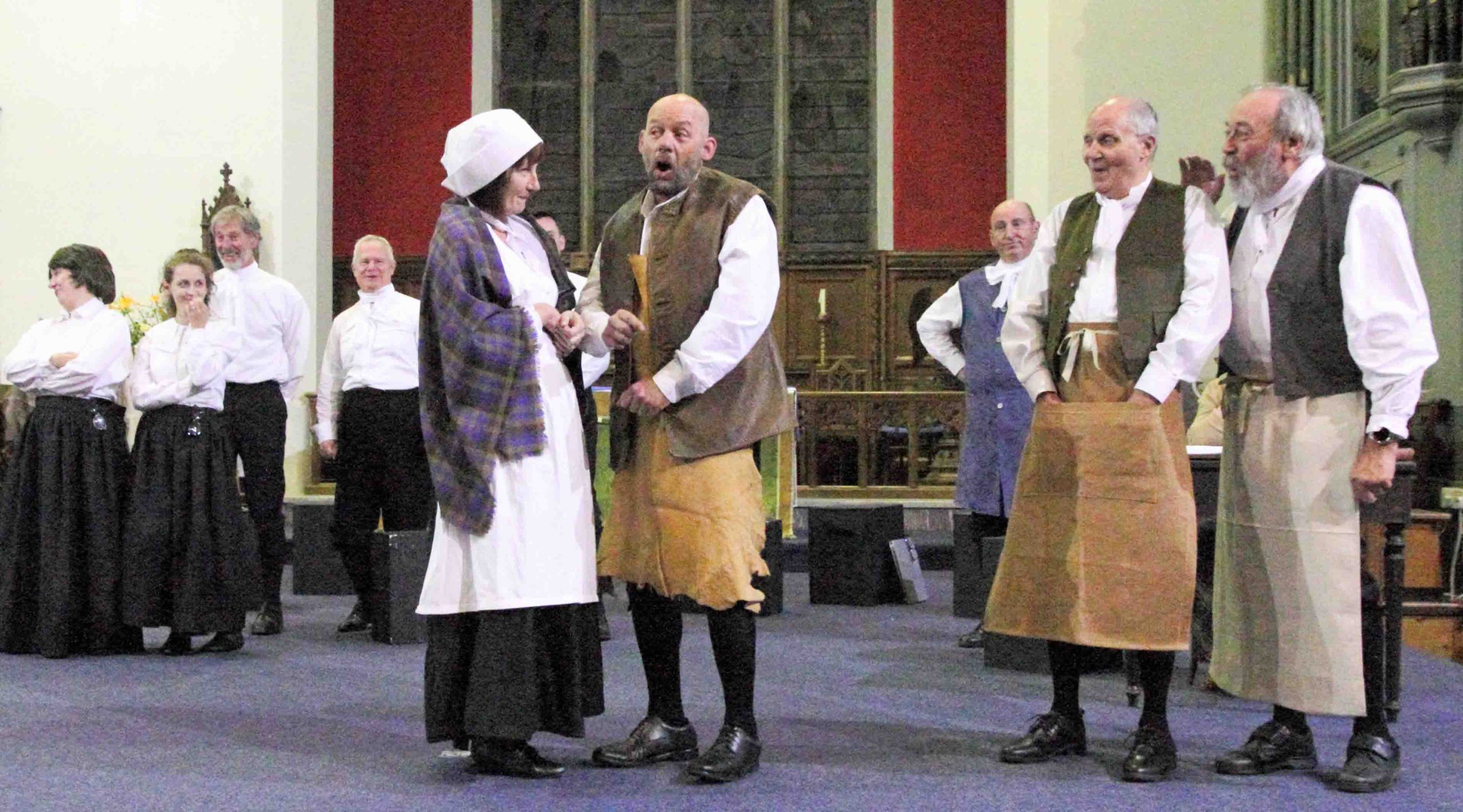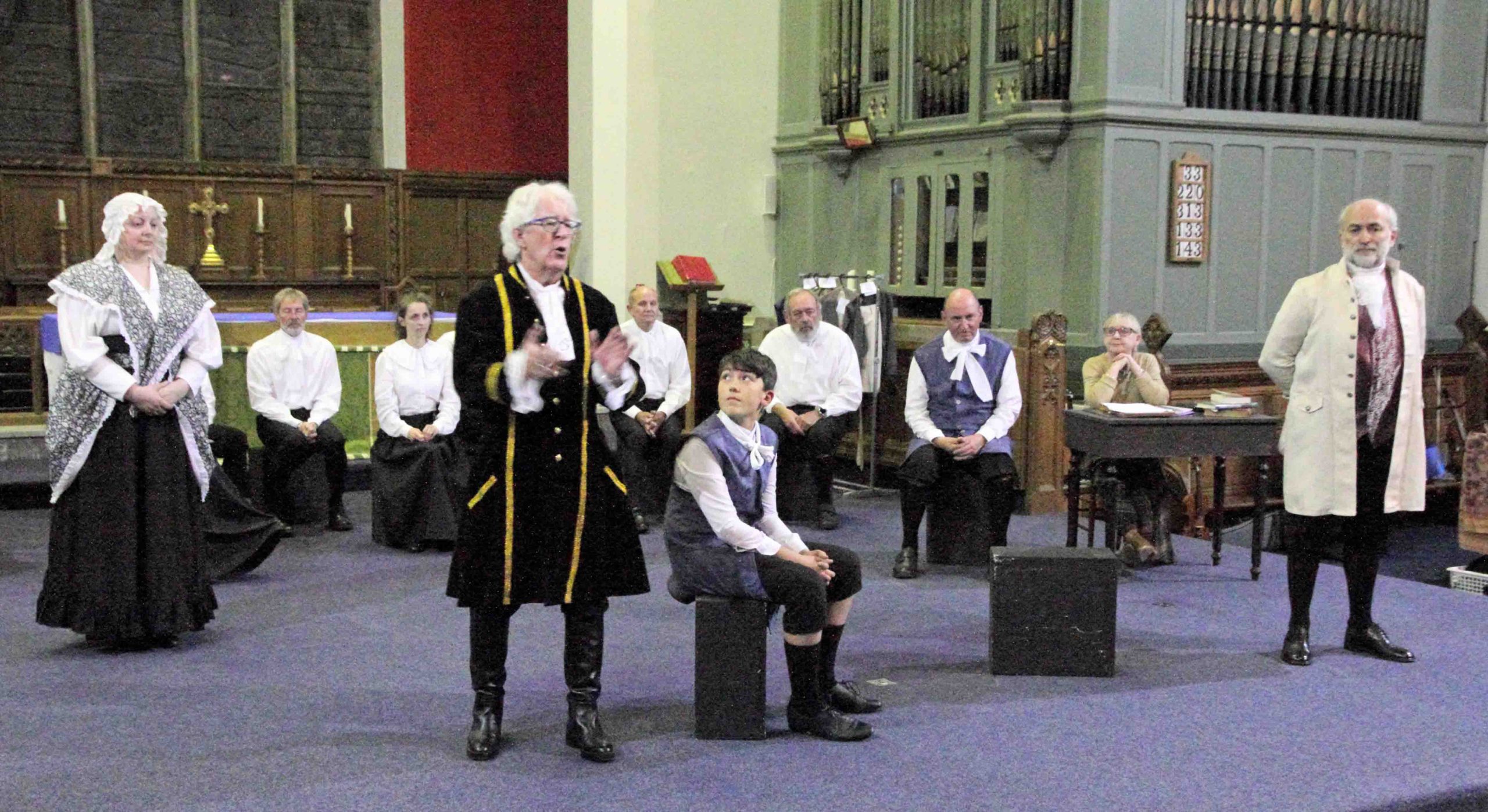 The atmosphere in St. Cuthbert‘s Church Pateley Bridge was lively, bustling and expectant. People were milling around, greeting friends and acquaintances as if they had not seen them for many months. They were selecting chairs at the front of the church when normally they would sit as far back as possible! The altar had gone and in its place was a large open area. The people purposefully congregating in this space were dressed in basic attractive black and white attire from three hundred years ago.