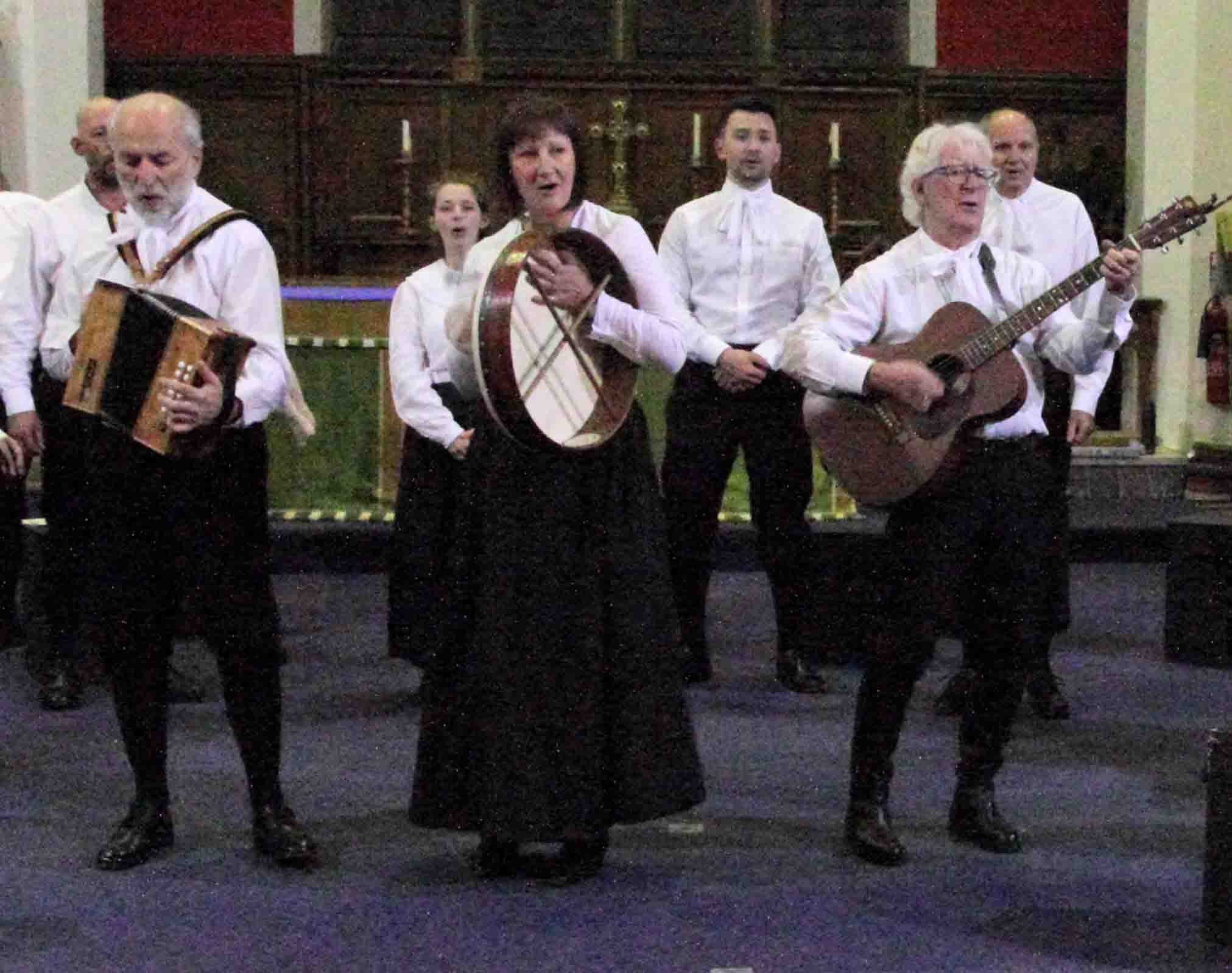 In no time we were treated to the first of the excellent songs that we had grown to expect in Nevin’s plays. Talented instrumentalists Steve Rouse, Heather Appleton, and Carol Bailey joined Nevin and the whole cast to sing a traditional song, ‘Fathom the Bowl’. The enthusiastic applause which followed showed that the audience were fully appreciative of another of Nevin Ward’s treats.
