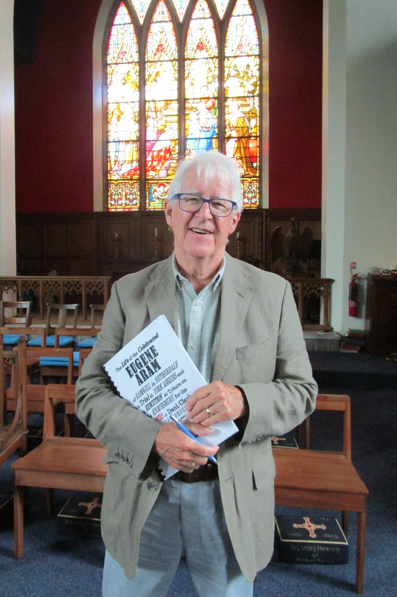 We were awaiting Nevin Ward’s new play, ‘ The Life of the celebrated Eugene Aram of Ramsgill in Netherdale’, to be presented in St. Cuthbert’s Church rather than the Playhouse, where ongoing alterations precluded productions in the Pateley Bridge Dramatic Society’s home. Nevin’s reputation has gone before him; we remembered his previous history plays: ‘The Dam Play’ and ‘Gouthwaite Hall’ as well as ‘The Wind in the Willows’, ‘A Christmas Carol” and the Mediaeval Mystery plays of 2000. I have my own memories of the help he gave me by providing the music for the 1977 pageant we produced at Burnt Yates School. We all knew that we were in safe hands and that the evening ahead of us would be filled with imaginative staging, lively music and excellent acting as we heard of Eugene Aram’s birth in Ramsgill in 1704, his early life and unusual education, and the events which led him to be tried at York Assizes before his execution on the Knavesmire for the murder of Daniel Clark at Knaresborough.