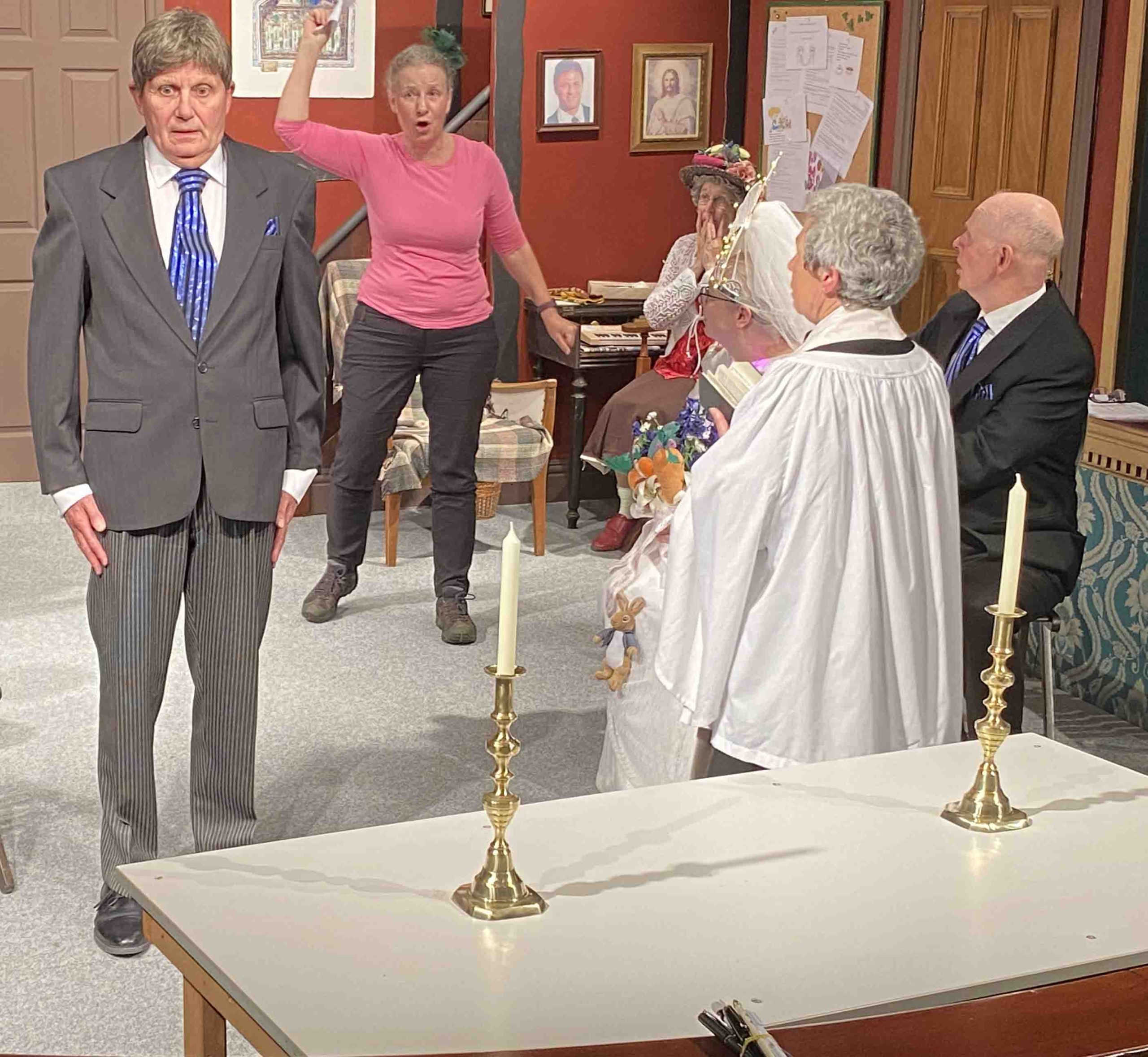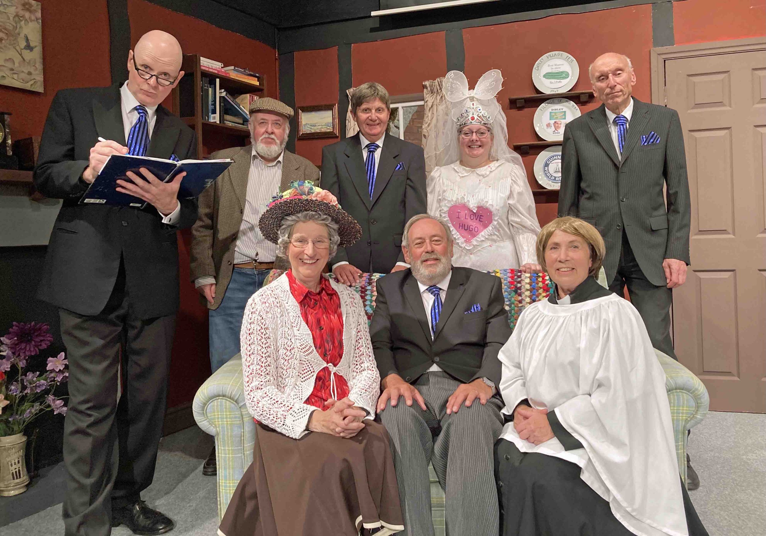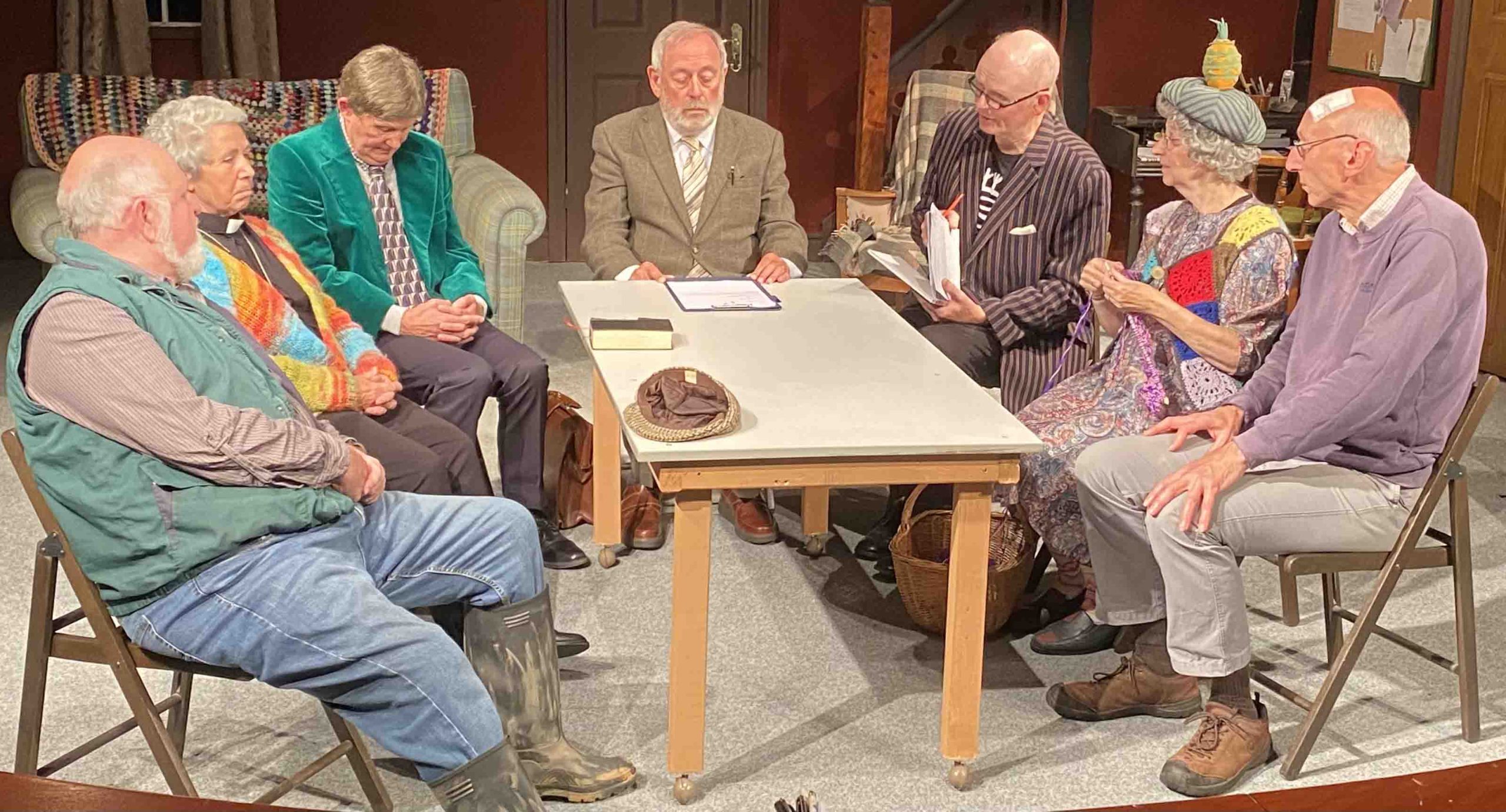 The back of the stage is the setting for the Vicarage.  The front of the stage used as the setting for the hilarious Parish Council meetings.  Jerry Harvey relishes his part as David Horton, a boorish man who bullies his gentle son played by Peter Buller.  Peter uses the mannerisms of the original character but brings his own charm.  Joyce Liggins plays Mrs Cropley whose bizarre cooking creates havoc.  Her amazing hats and outfits saying more about the character than what she actually says.  Chris Iredale is the pedantic Parish Clerk, comically constructing Minutes of the meetings.  Iain Johnson as Owen Hewitt, troubled with his digestion, throws himself into the part with energy.  Steve Hunt plays Jim Trott with extra relish.