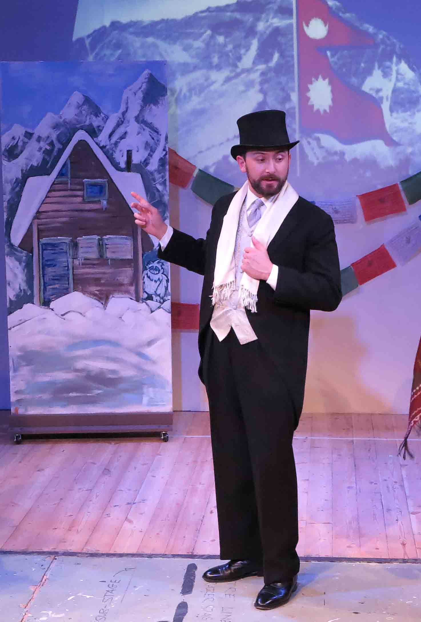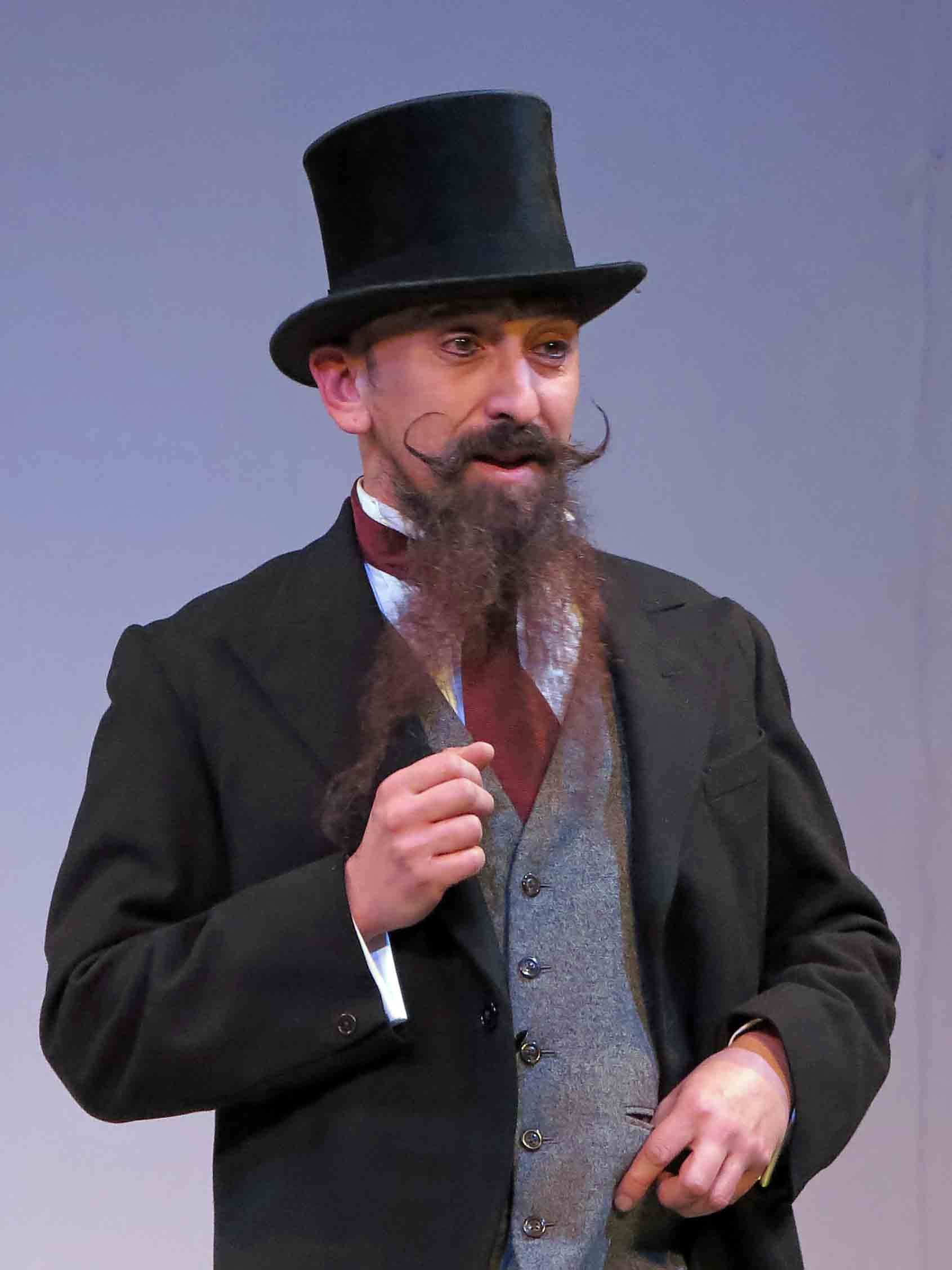 If you know the story, Fogg wagers that he will travel around the world within 80 days – in this version, he has that wager with Gringeworthy, the villain of the piece, played by Rich Blackburn. Rich elicited boos and hisses from the audience on his every entrance – a masterful portrayal of a Victorian villain. And, I have to mention the magnificent beard!