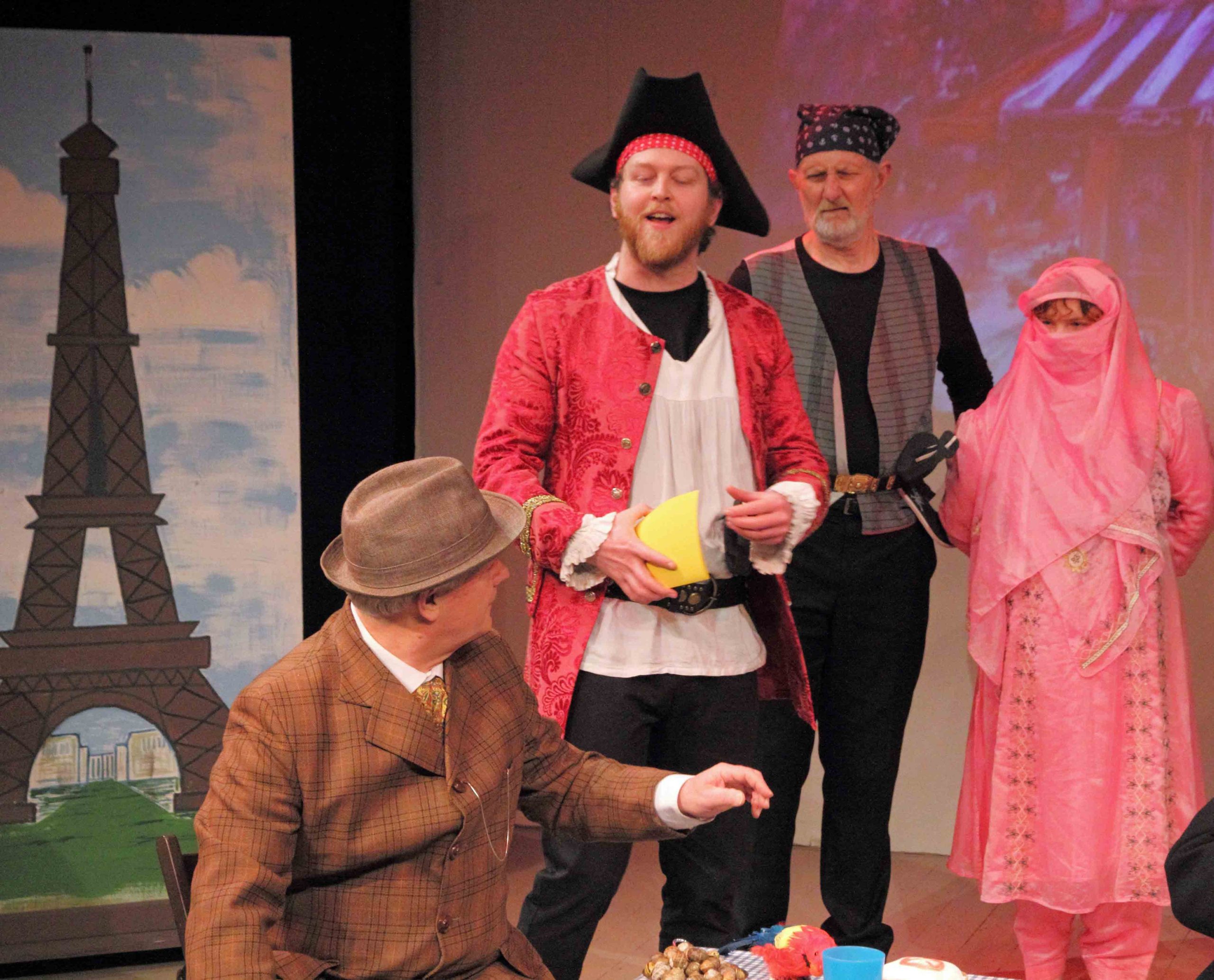 As Fogg journeyed across the world he encountered a variety of characters ranging from native Americans and pirates through to the Dalai Lama – all of them played slightly tongue in cheek, as you would expect in a pantomime. So, well done to Hugh Cawley (Flannagan & Dalai Lama); Jerry Harvey (Thompson & Rusty Spoke); George Collinson (Pirate Captain); Linda Harvey (Helena Carter); Jo Wright (Indian Maharina); Steve Hunt (General Custer & Surfina’s Father); Andy White (Captain Speedy); Darryl Hall (Chief Sitting Bull) and Phoebe Kendall (Snowman, Servant & Nobby the Knit).
