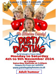 Home - Past Productions - 2024 - Dirty Dusting Dirty Dusting Pateley Playhouse 4th – 9th November Written by Ed Waugh and Trevor Wood Directed by Ben Derrick Reviews and Photographs- click on the links below: Review by Jay Cundell Walker, NODA Review by Ellie Jackson